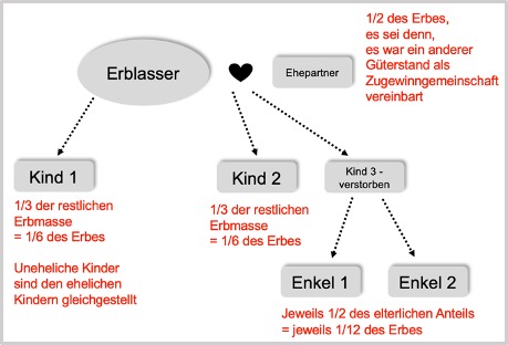 Sie sind z.B. verheiratet ohne Ehevertrag, haben 3 Kinder, von denen jedoch ein Kind bereits selbst verstorben ist. Von diesem verstorbenen Kind haben Sie jedoch bereits 2 Enkelkinder.