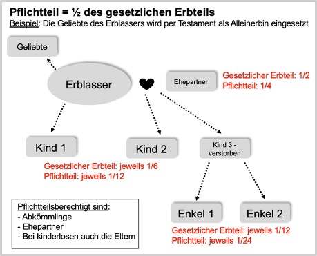 Wir bleiben bei der vorangegangenen Familiensituation, nur mit der kleinen gedanklichen Änderung, dass der Verstorbene an dieser Stelle zusätzlich zum Ehepartner noch eine Geliebte hatte. Und dieser Geliebten hinterlässt der untreue Familienvater per Testament sein komplettes Vermögen. Trotz dieses Testaments gehen die Ehefrau und die Kinder an dieser Stelle nicht leer aus. Die Geliebte erhält zwar zunächst den kompletten Nachlass, ist aber verpflichtet, den pflichtteilsberechtigten Angehörigen ihren jeweiligen Pflichtteil auszuzahlen. Jeder der berechtigten Angehörigen erhält nun die Hälfte seines gesetzlichen Anteils, so dass der Geliebten am Ende nur noch die Hälfte der Erbmasse verbleibt.